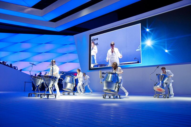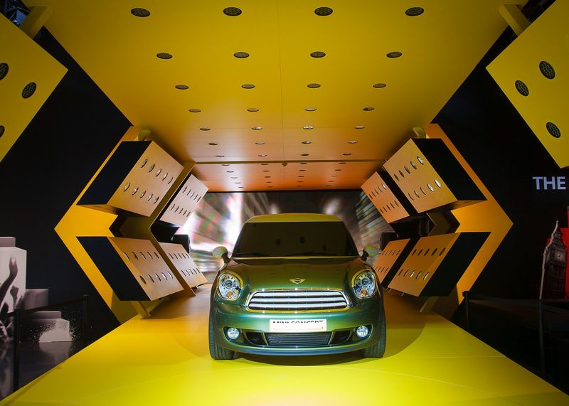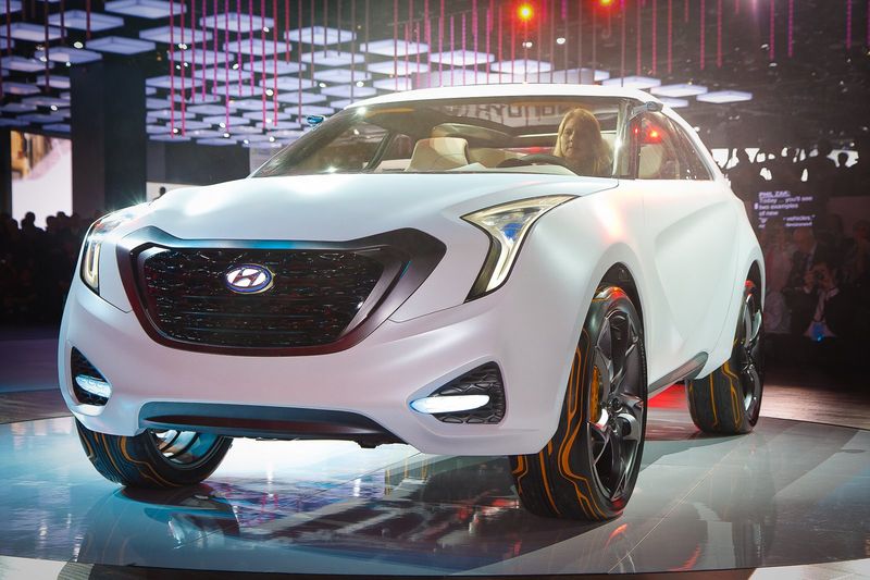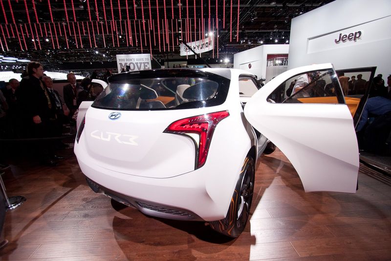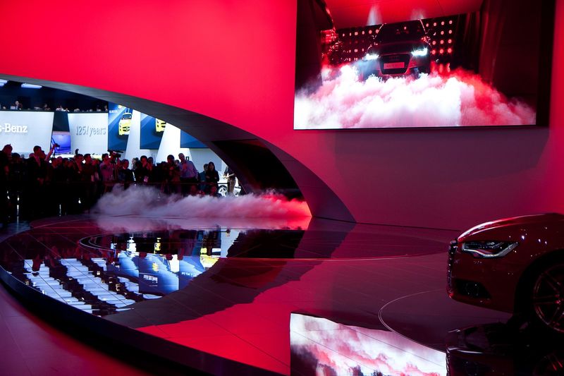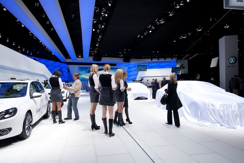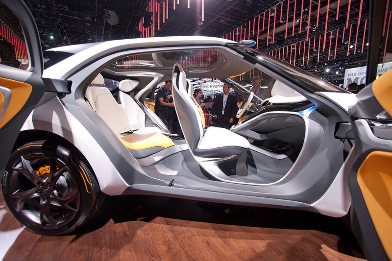 Отримавши іменний бейджик на шнурочку і червоний браслетик на руку, можна починати роботу. Розклад роботи шоу чітко розписаний організаторами щохвилинно – сніданок коло стенду Порше, урочисте відкриття, а далі кожна фірма має 25-30 хвилин на презентацію своєї продукції на колесах. Презентації проходять по стандартному сценарію – на великих сценах власного дизайну провідні спеціалісти чи генеральні менеджери представлють новинки від своїх фірм. Багатші фірми то все знімають на відео, яке одразу транслюється на екранах сцени. Потім гучна музика, дим, яскраве і кольорове світло – і виїжджає якесь новеньке чудо. Якщо в минулі роки концепт кари не представляли хіба що найбідніші фірми, то в ці роки концептуальні розробки є великою рідкістю. Тому і корейський автопром приємно дивує Хюндай представив і концепт, і новинку – хетчбек Veloster, дуже приємну машинку. Вона не традиційно асиметрична – зі сторони водія тільки одна дверця, коли з другої сторони їх двоє. І ще задні дверці. Дуже цікава машинка, стартова ціна якої в Штатах буде починатись з 17 тис доларів.