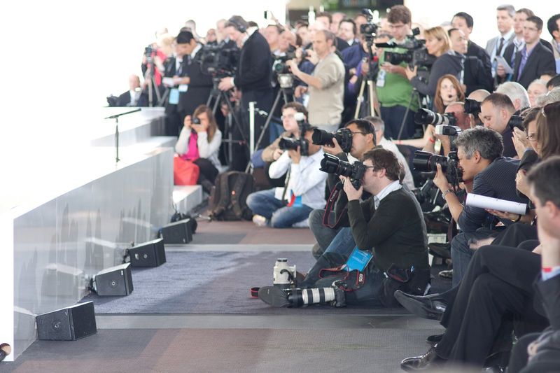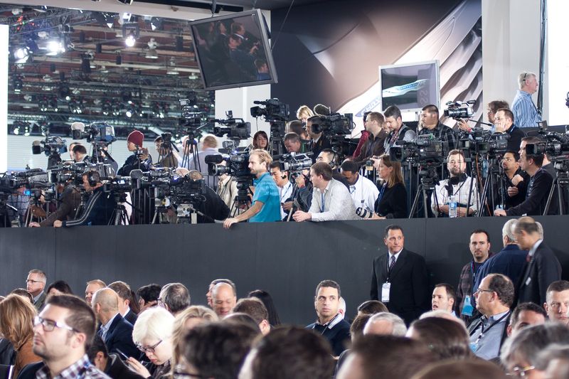 А тепер інсайдерські враження. Коло 5 тис журналістів з 63 країн світу. України там не було офіційно, я там був від чікагського журналу. Цілий табун журналістів з фото і відео технікою. Причому заядлі профі мали вкрай знищену техніку – це в них робота! В коротеньких перервах між презентаціями фотографи на нетбуках швиденько обробляли фото і передавали по ФТП на свої сайти. Вай Фай в залі був просто критично завантажений, то декотрі фотографи підключали до нетбуків на скотч мобілки і користувались нетом мобільного оператора. Але в загальному атмосфера серед журналістів була веселою, не вимушеною. Часто звучали смішки, якісь веселі бувальщини. Всюди коло стендів були безкоштовні кава, солодощі, мінеральна вода. Вмерти з голоду було не можливо. Судячи по прізвищам на бейджиках, журналісти в основному з англомовних країн. Але на кожному кроці було чути німецьку мову. Ну і велика кількість азіатів, які були усюди. Було таке враження, що відкриєш багажник авто і там буде сидіти китаєць! Дівчата-моделі на стендах вдягнуті спеціально по діловому, нема надлишкової сексуальності, що прямує до еротики. Це пояснюється просто – на авто шоу американці приходять з дітьми і вони не хочуть пояснювати дітям, чого та цьоця забула вдягнутися і чи її свербить животик, якщо вона без перестанку треться ним до машини!