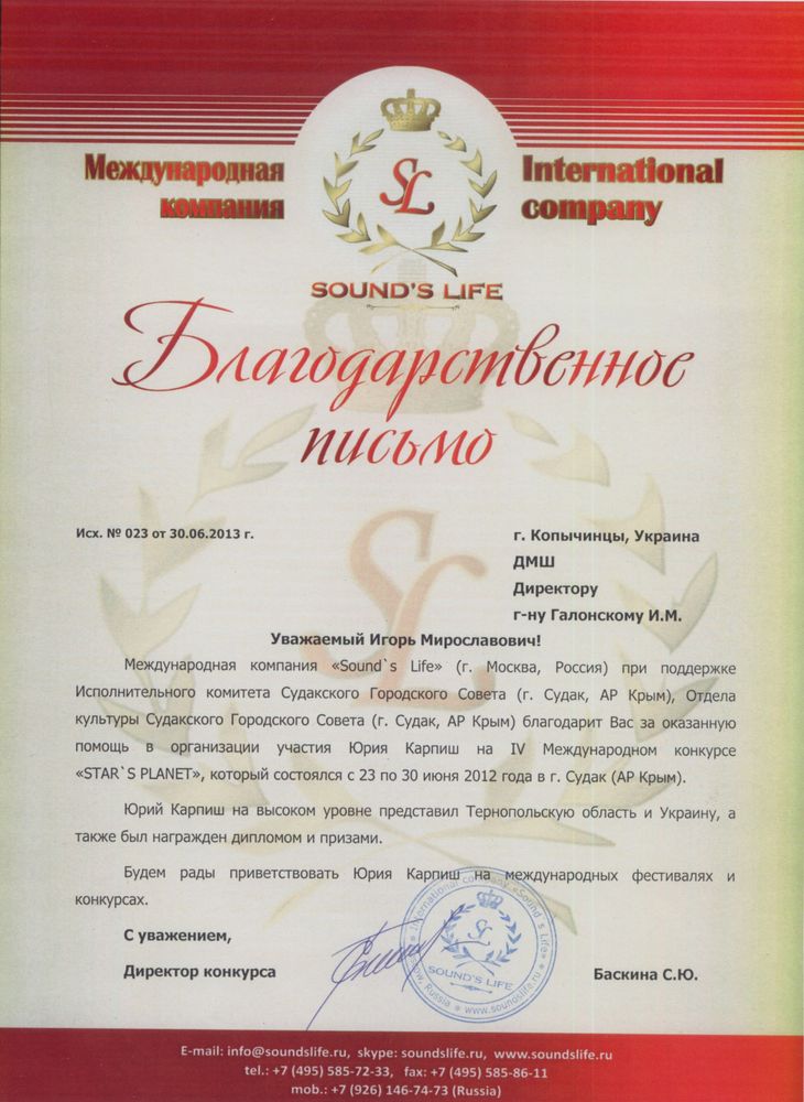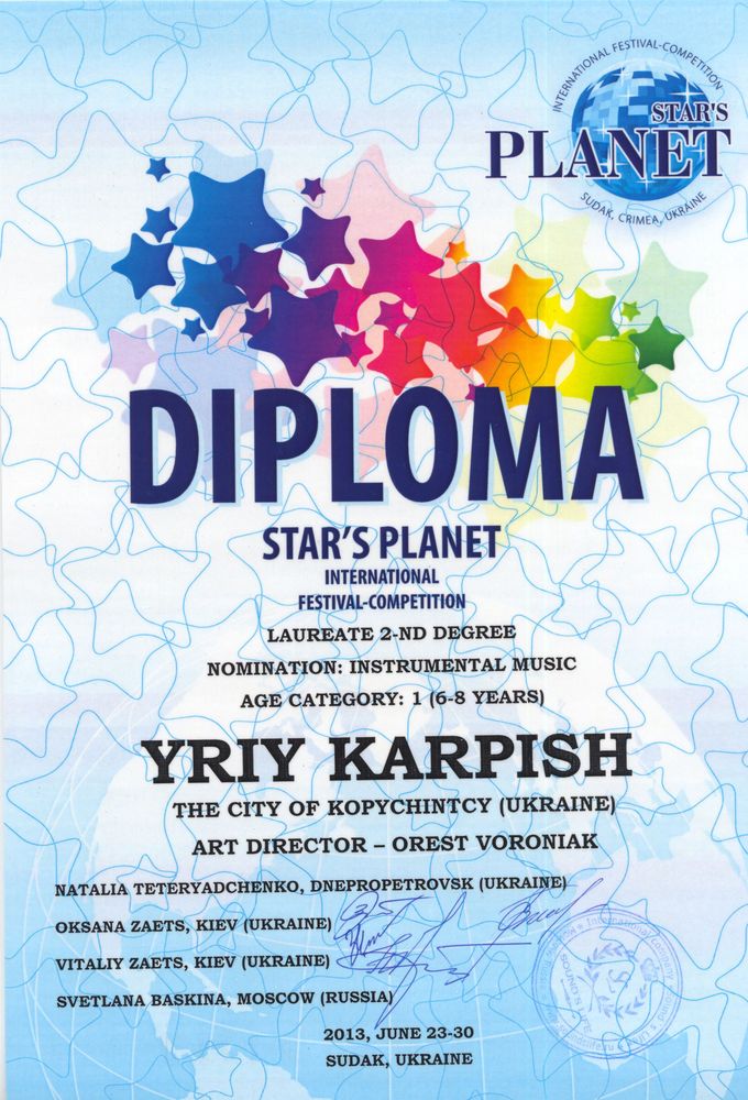 В номінації «інструментальна музика» Копичинецьку музичну школу, Тернопільську область, Україну на цьому конкурсі представляв 8-річний музикант Юрій Карпіш, який займається у викладача-професіонала «спеціаліста вищої категорії», «музиканта від Бога» Вороняка Ореста Івановича. Завдяки тісної співпраці учня-викладача-батьків як результат – участь у міжнародному конкурсі та почесний Диплом лауреата (2-а премія).