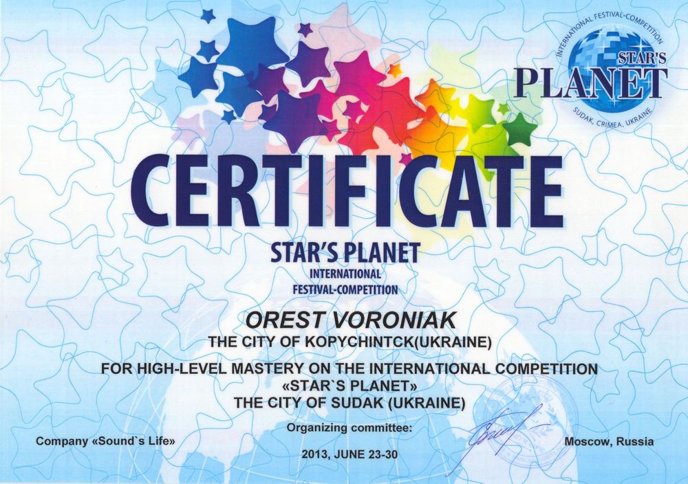 З 23 по 30 червня в м. Судак АР Крим відбувся 4-й Міжнародний конкурс « STARS PLANET» (« ПЛАНЕТА ЗІРОК»). Конкурс проводився у чотирьох номінаціях: «вокал», « інструментальна музика», «хореографія» і « оригінальний жанр». У ньому взяло участь майже 100 учасників з різних країн світу.
