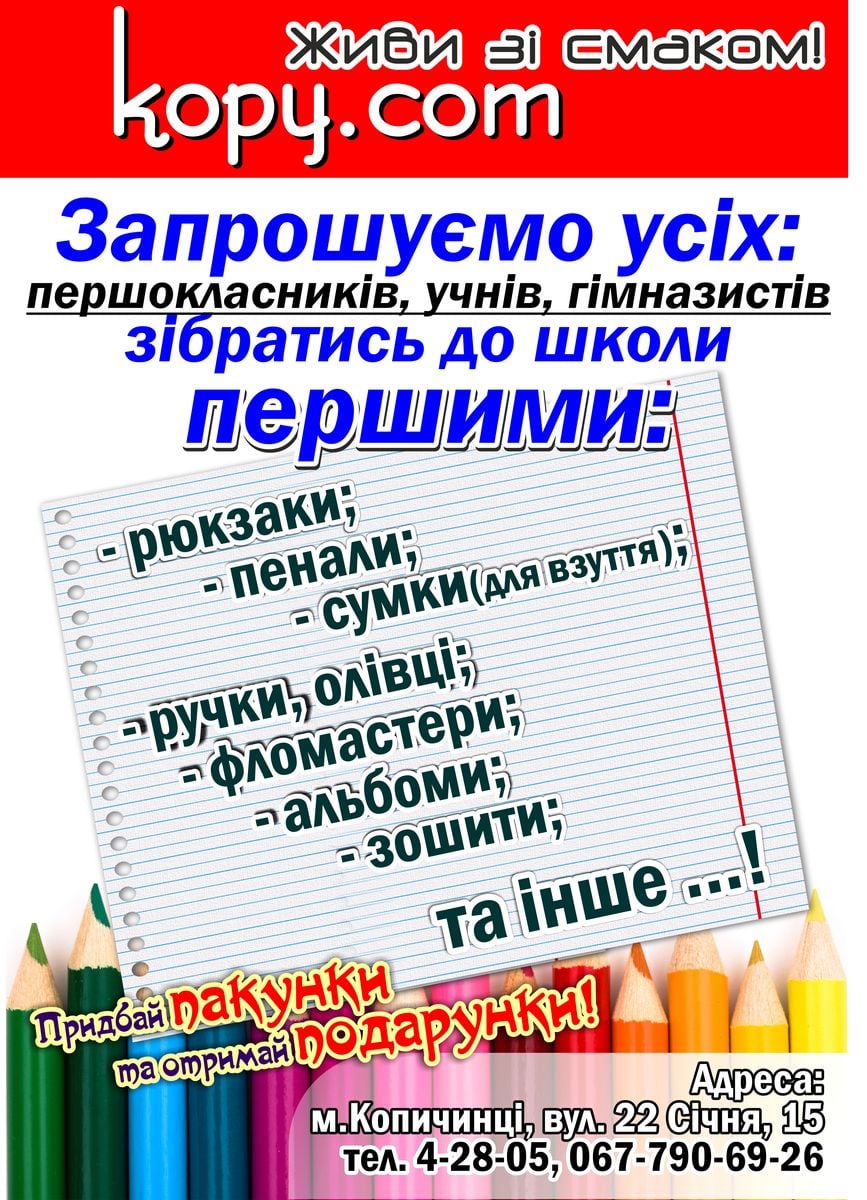 Kopy.com запрошує всіх: першокласників, учнів, гімназистів зібратись до школи першими. В асортименті рюкзаки, пенали, сумки, ручки, олівці, фломастери, альбоми, зошити і багато іншого