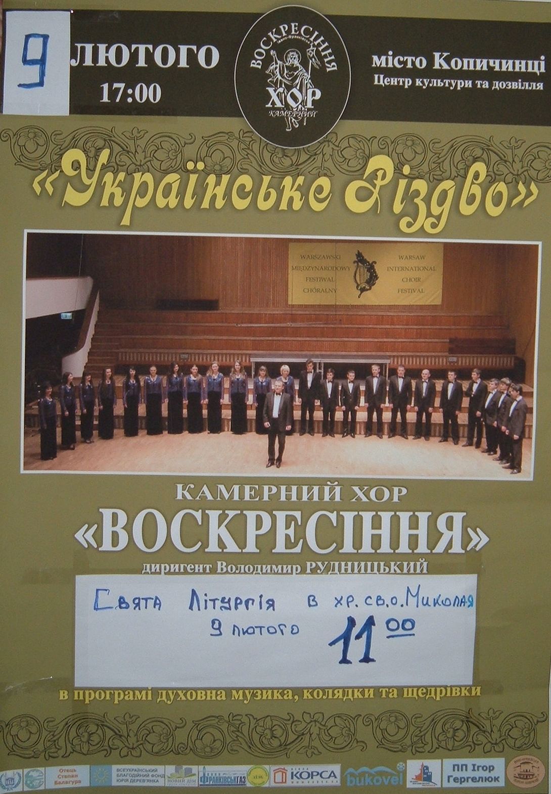 9 лютого в приміщенні Центру Культури і Дозвілля відбудеться виступ камерного хору "Воскресіння" з програмою "Українське Різдво". Початок о 17.00