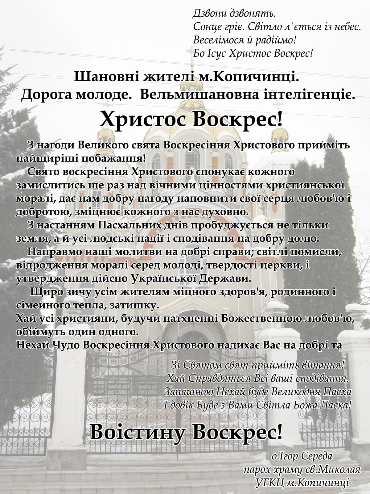 З настанням Пасхальних днів пробуджується не тільки земля, а й усі людські надії і сподівання на добру долю. Направмо наші молитви на добрі справи; світлі помисли, відродження моралі серед молоді, твердості церкви, і утвердження дійсно Української Держави.