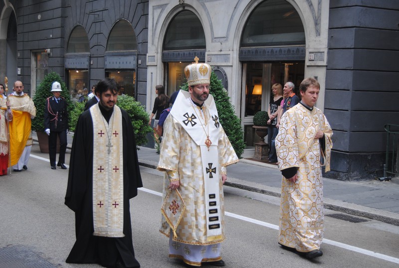 Розпочалась Архиєрейська Божественна Літургія у співслужінні священиків римського обряду: дон Піера Джакози, ректора духовної семінарії м.Савона, дон Паола Ромео, співзасновника громади, а також о.Олега Сороки, священика з України. Так, як на Богослужені були чисельні італійські вірні, то було використано тексти молитов українською та італійською мовами. Дияконську службу вправно він о.диякон Андрій Салабай, студент Риму.